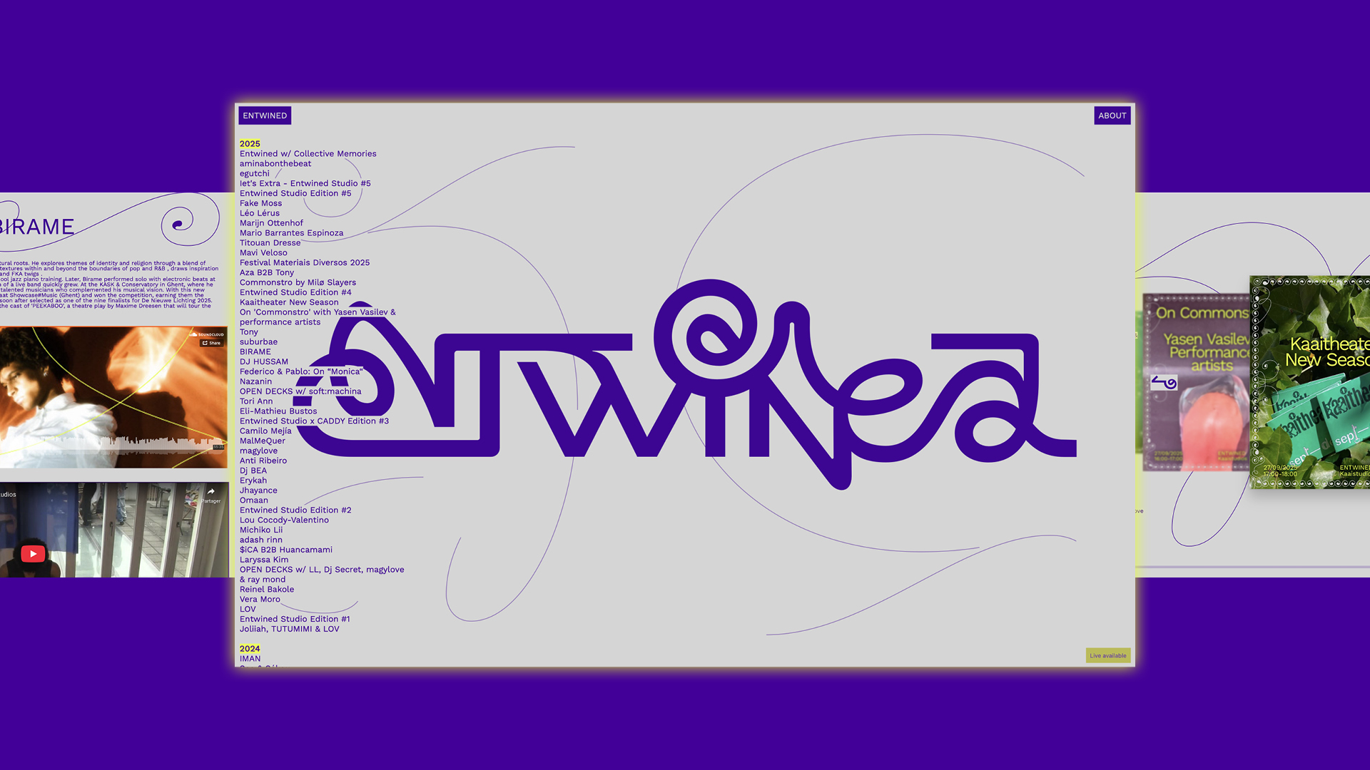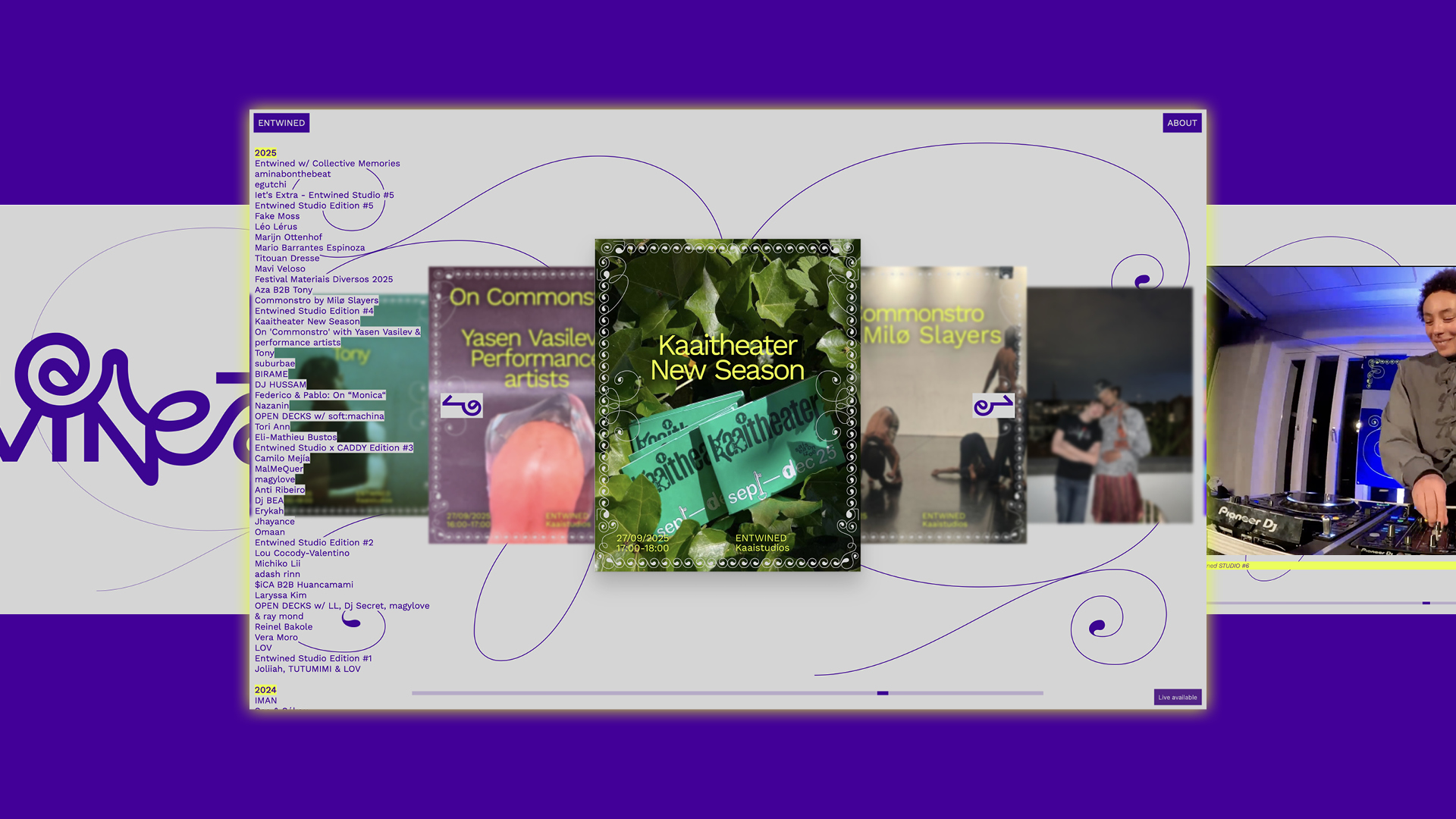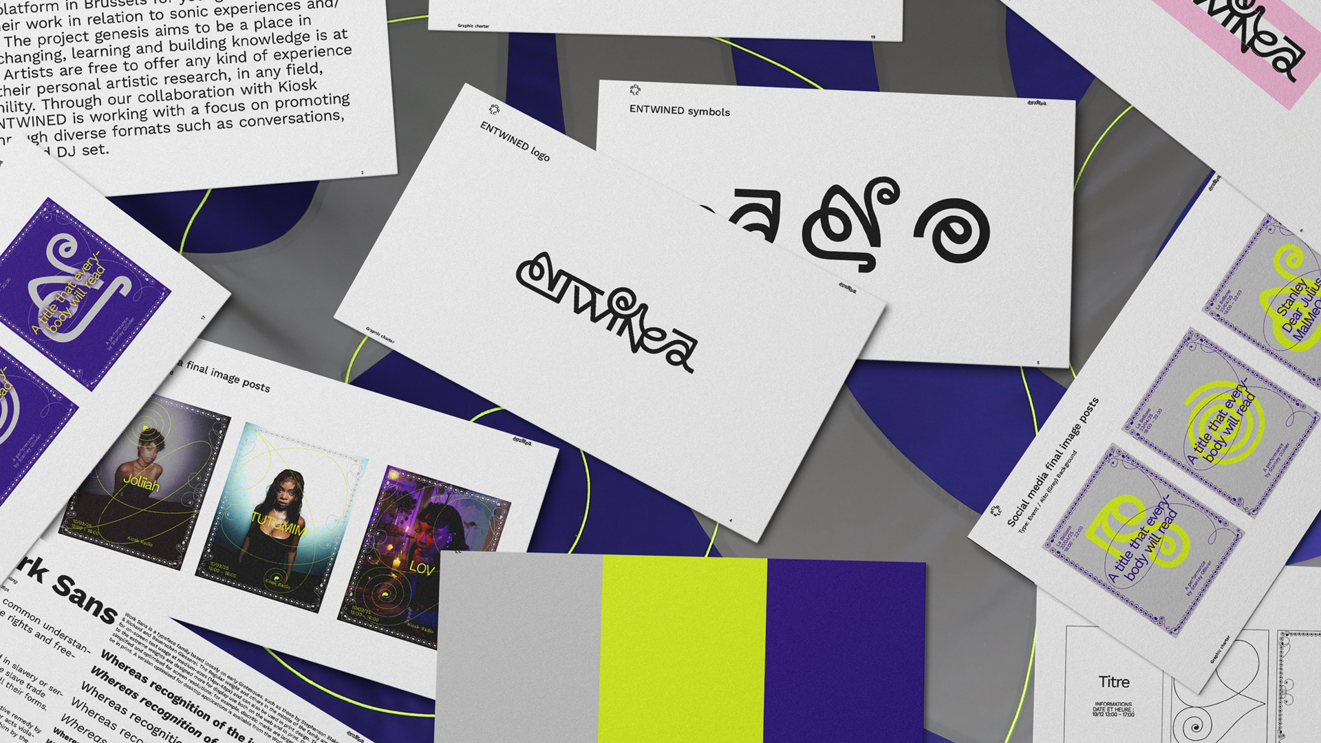 We have visually brought Entwined to life, an interdisciplinary theatrical and audiovisual radio collective. This collective curates and organises events focused on international artistic diversity and mediation, with the aim of creating new links between different artistic fields. The Entwined collective covers a wide range of practices, highlighting the presence of sound, music and performance in our everyday environment.