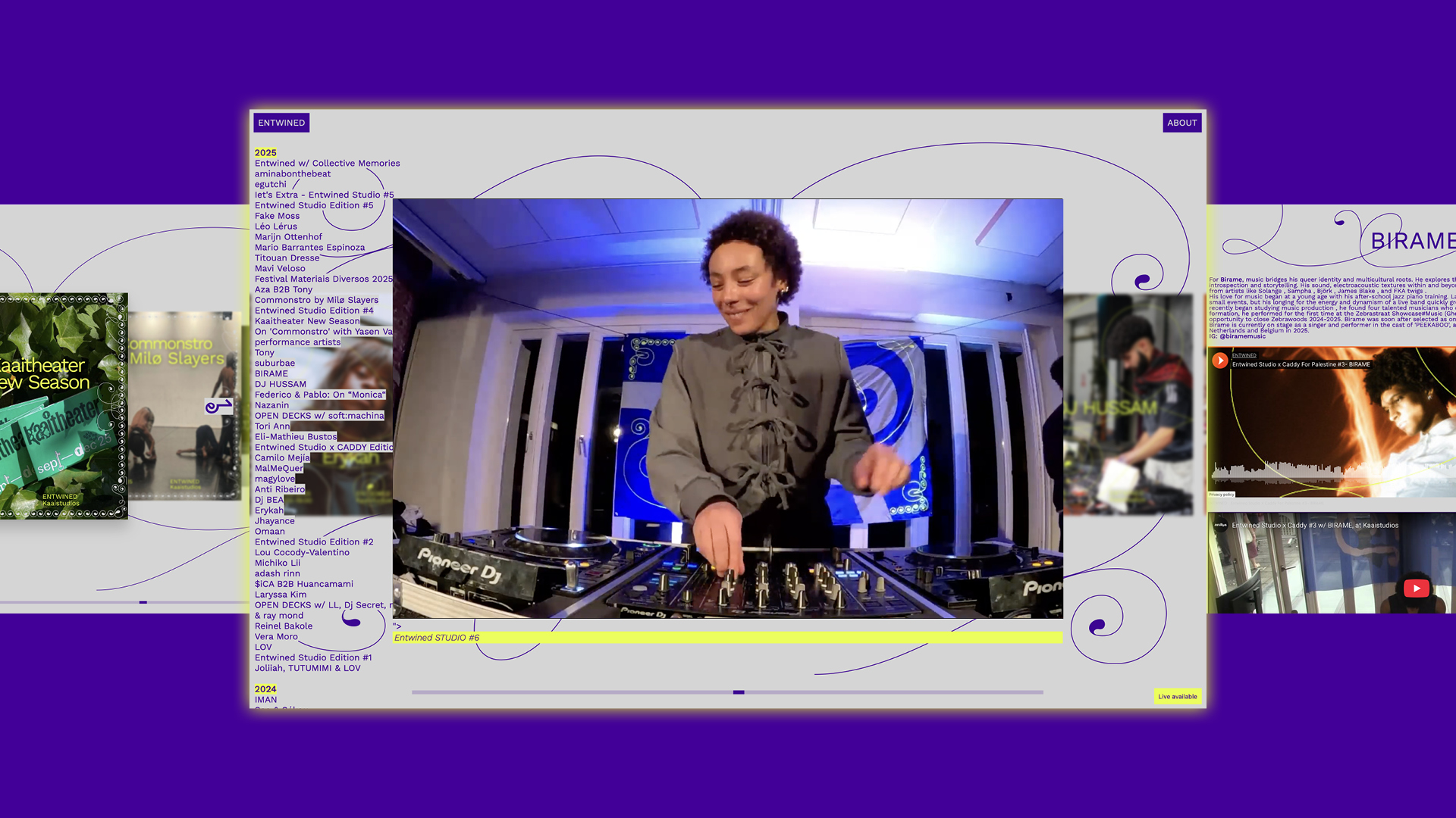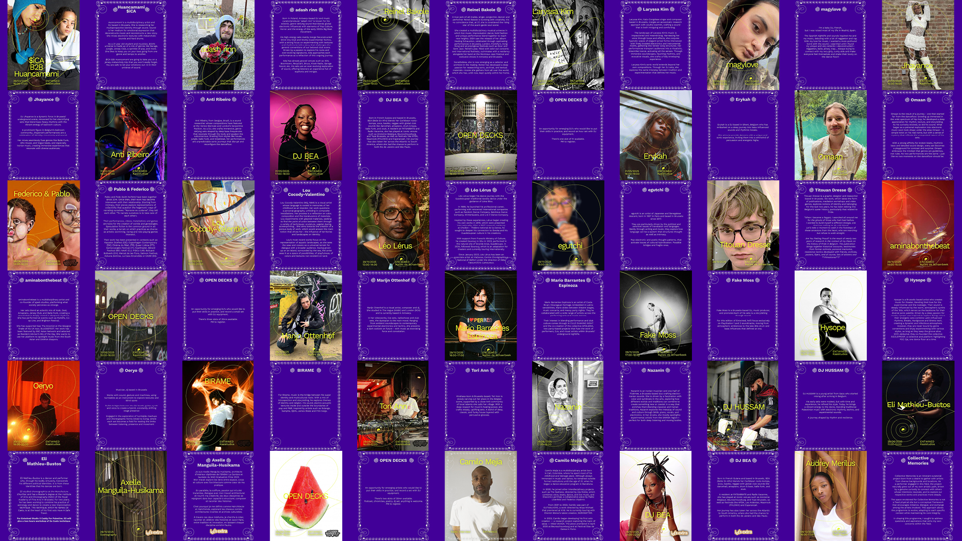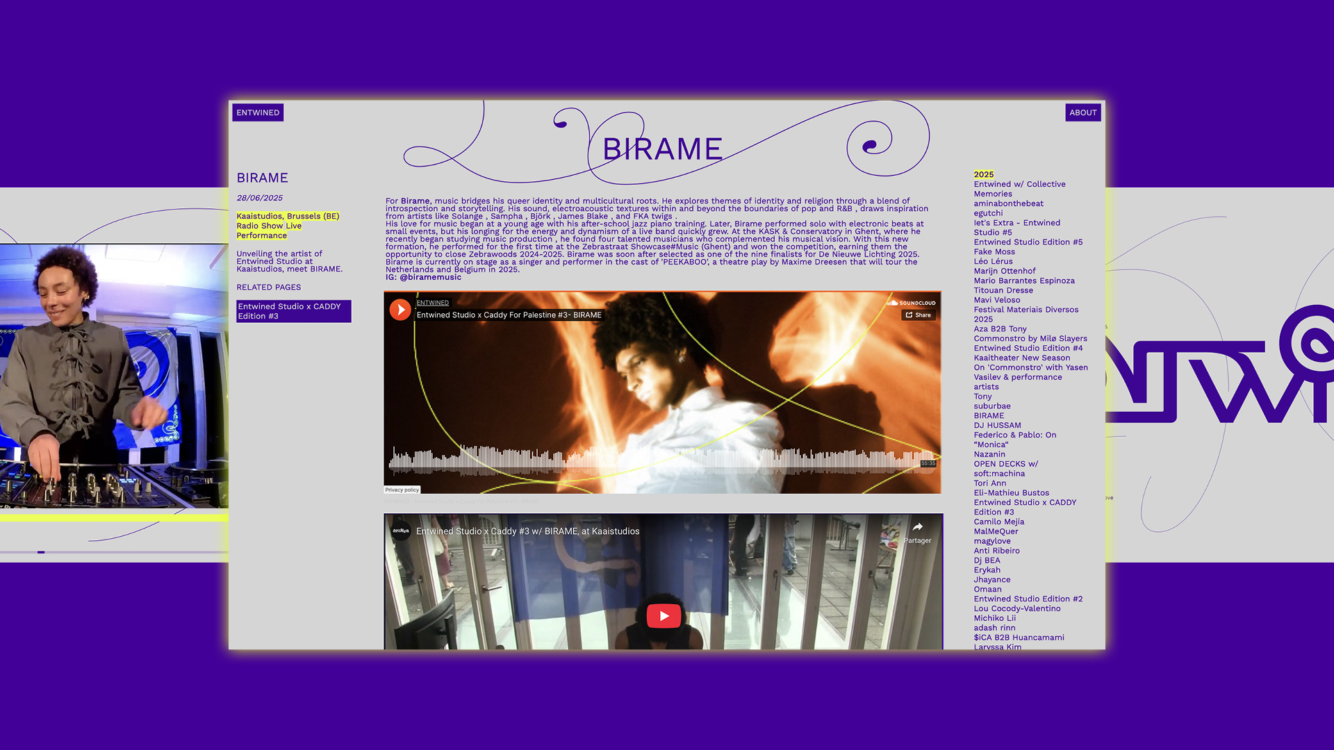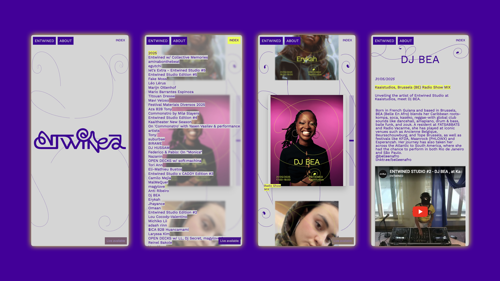 We have visually brought Entwined to life, an interdisciplinary theatrical and audiovisual radio collective. This collective curates and organises events focused on international artistic diversity and mediation, with the aim of creating new links between different artistic fields. The Entwined collective covers a wide range of practices, highlighting the presence of sound, music and performance in our everyday environment.