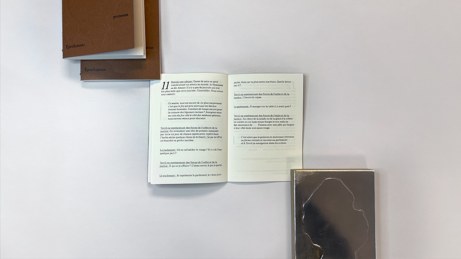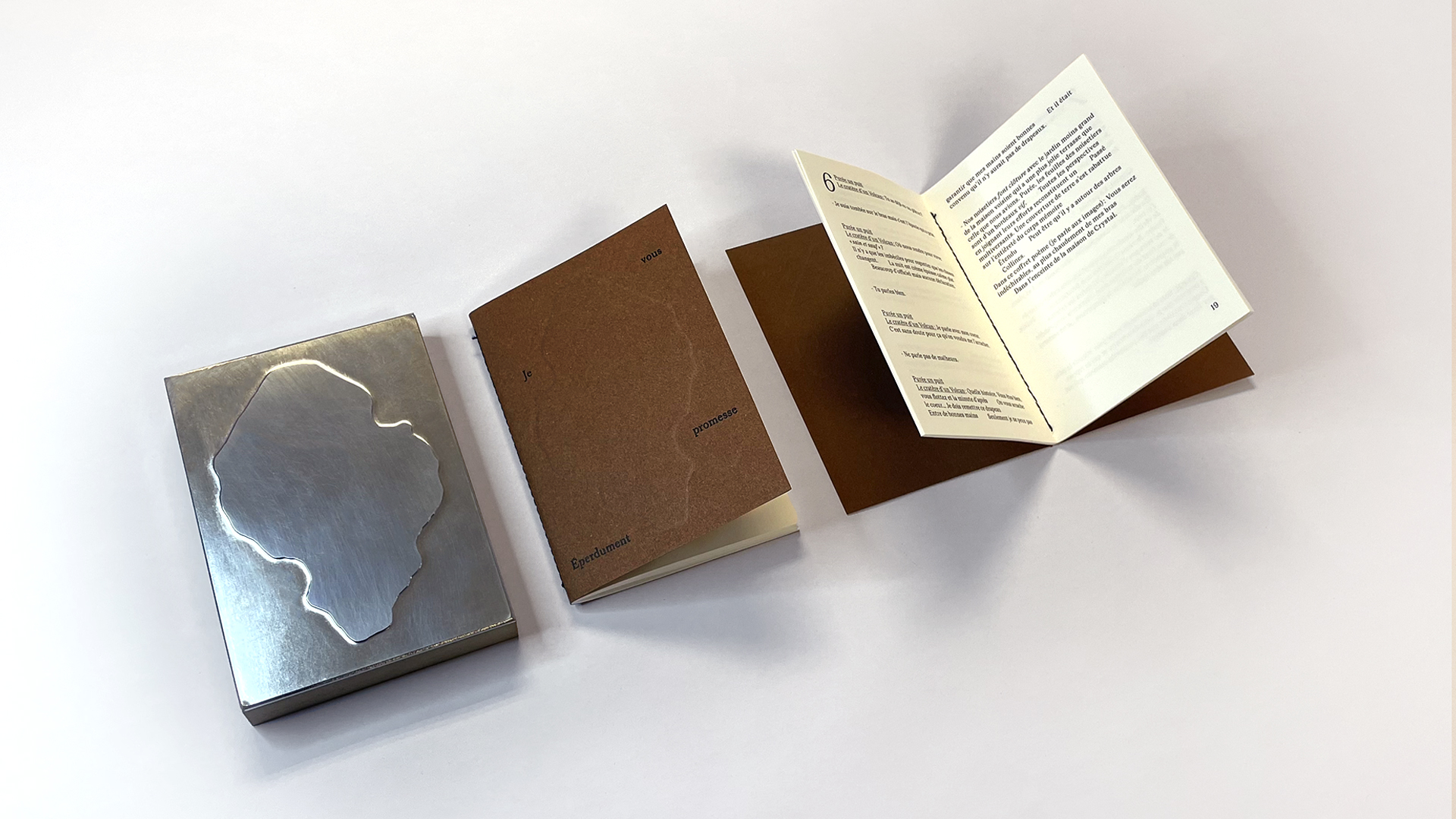 Je vous Promesse Éperdument est un receuil de poèmes écrit par Sophie Senecaut. À travers ses mots mêlant les thématiques du territoire, de l’identité et de l’habitat, l’écriture de l’artiste communique avec une mise en page langagière. Les mots deviennent composition, proposant un rebond entre souvenir, oralité et espace de transmission intime.